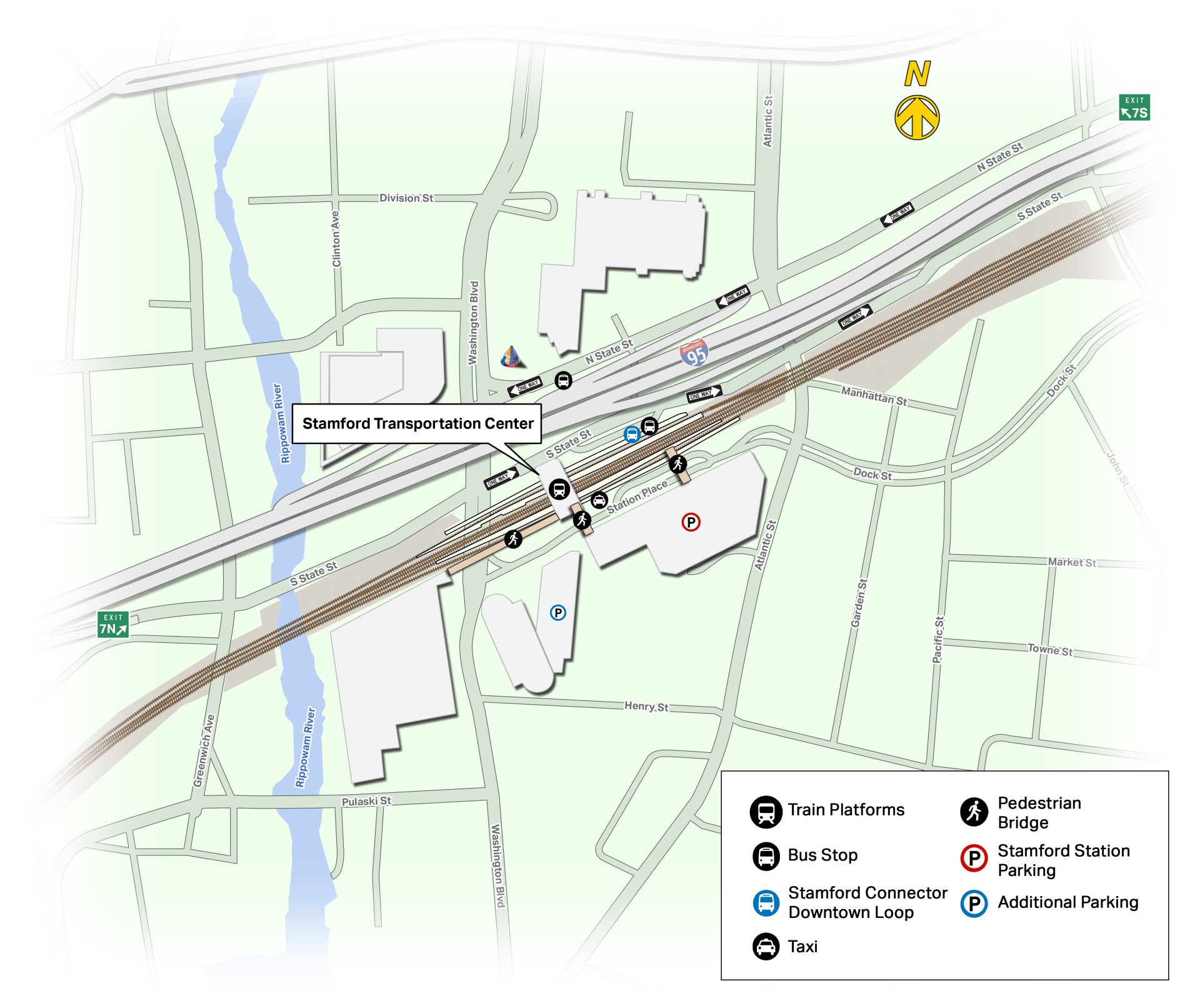 New Haven Line (Metro-North) offers rail service from Stamford to Grand Central Terminal in New York City and eastbound to New Haven, Connecticut.